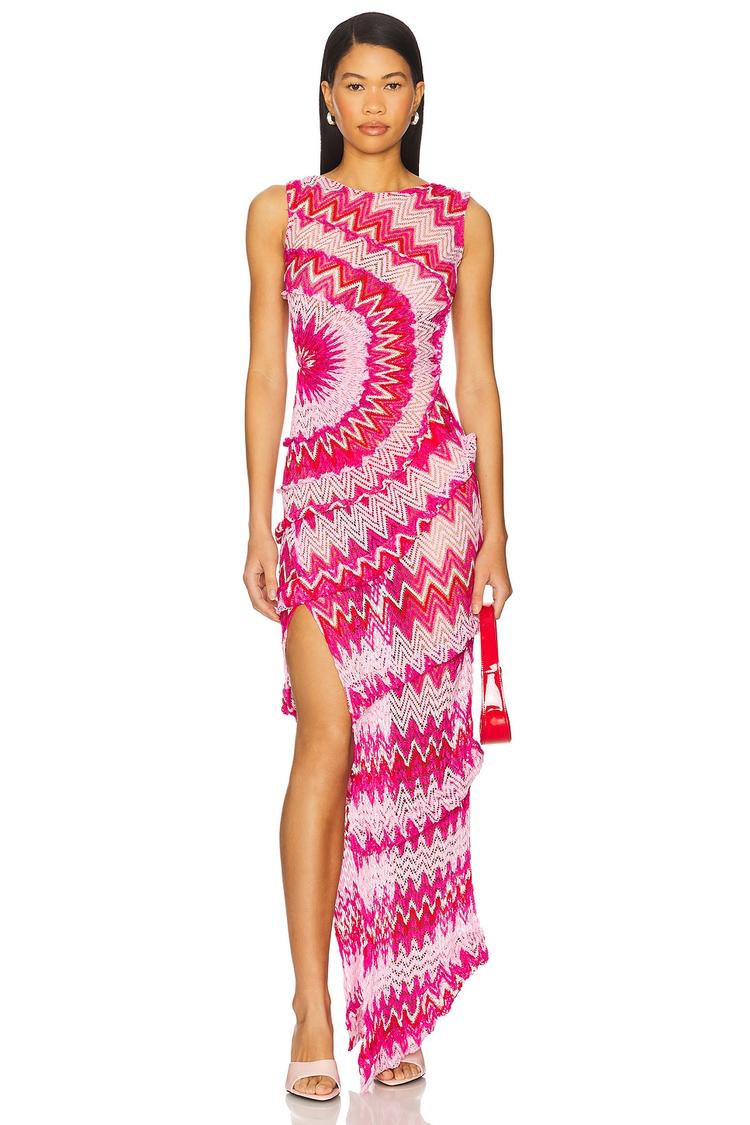 A mesmerizing pink and red abstract zigzag pattern adorns this sleek column maxi dress, crafted from a semi-sheer midweight knit fabric with subtle lurex shimmer. Featuring a round neckline and wide sleeveless straps, the slim fit silhouette highlights the figure with a ruffled spiral design that gently bunches at the side. The asymmetric hem with a high slit adds dynamic movement, making it ideal for cocktail parties, formal events, or stylish nights out during spring to autumn. The pull-on style ensures easy wear, complemented by a detached partial lining for comfort and sophistication.