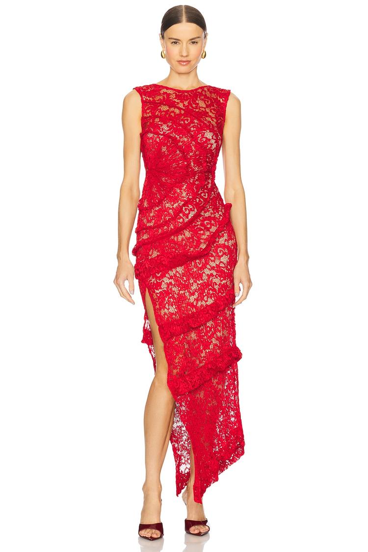 Intricately crafted from midweight lace, this fitted column dress features a bold asymmetrical hem with a dramatic side slit and spiral ruffled design that creates movement and elegance. The sleeveless silhouette and round neckline enhance its sophisticated appeal, making it an excellent choice for cocktail parties, semi-formal events, or romantic date nights. The partial lining ensures comfort while showcasing delicate lace texture. A standout piece that blends classic elegance with modern flair, designed for all-weather wear and refined occasions.