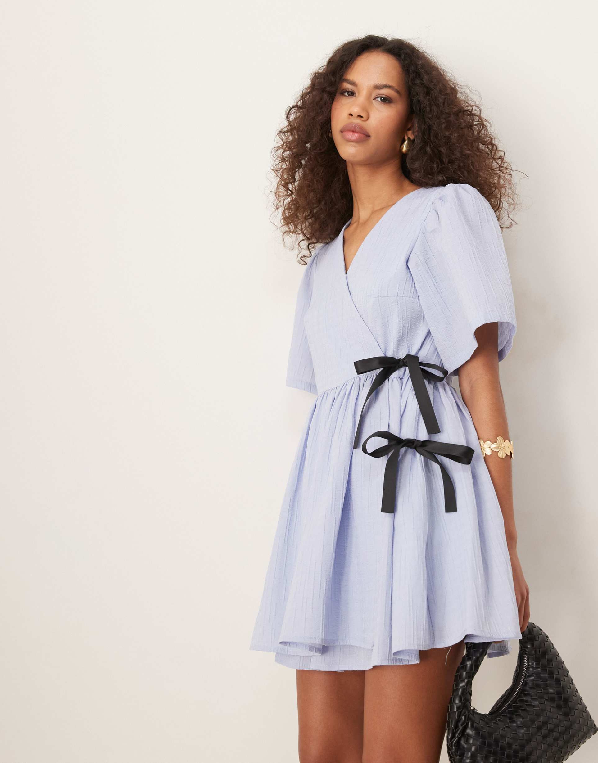 GHOSPELL CONTRAST BOW WRAP MINI DRESS IN CORNFLOWER BLUE