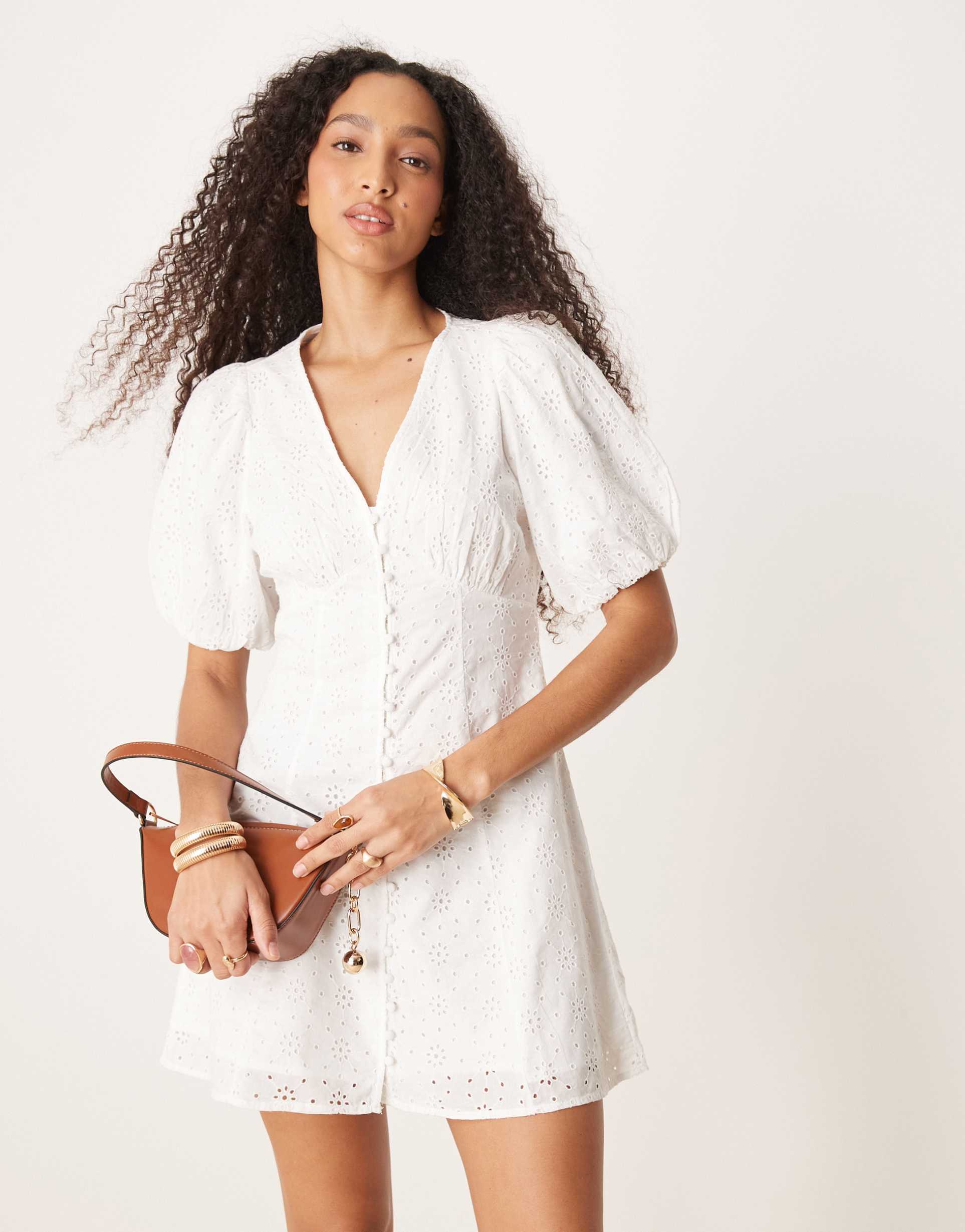 Soft broderie anglaise embroidery adorns this off-white mini dress, highlighting its romantic puffed half sleeves and classic V-neckline. Crafted from lightweight cotton, it offers a regular fit silhouette with a button-up front and shirred stretch panel at the back for comfort. The clean hemline and breathable fabric make it ideal for spring and summer occasions, such as graduation ceremonies, brunches, or date nights, combining timeless elegance with effortless wearability.