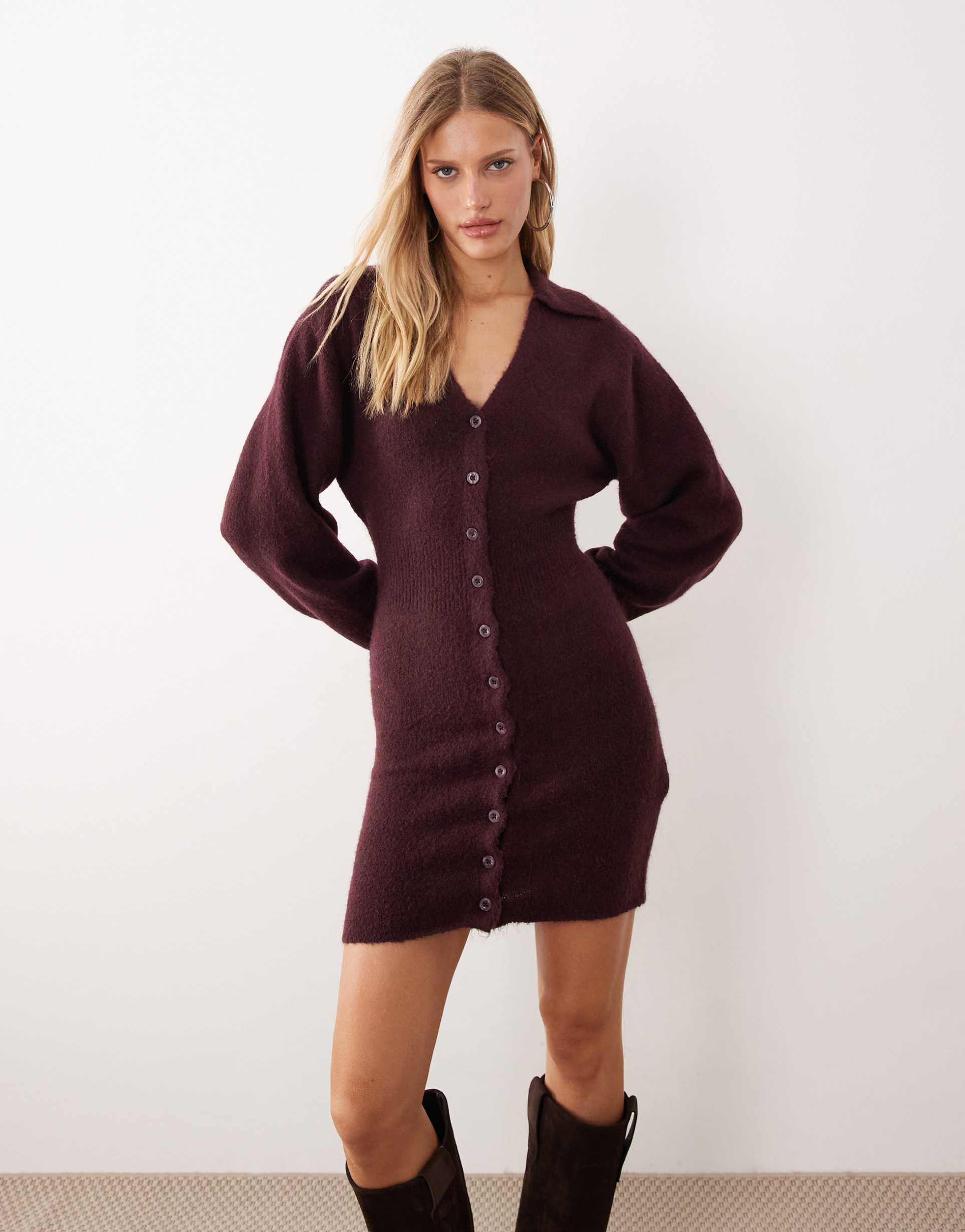 GINA TRICOT LONG SLEEVE KNIT BUTTON DOWN MINI DRESS IN BURGUNDY