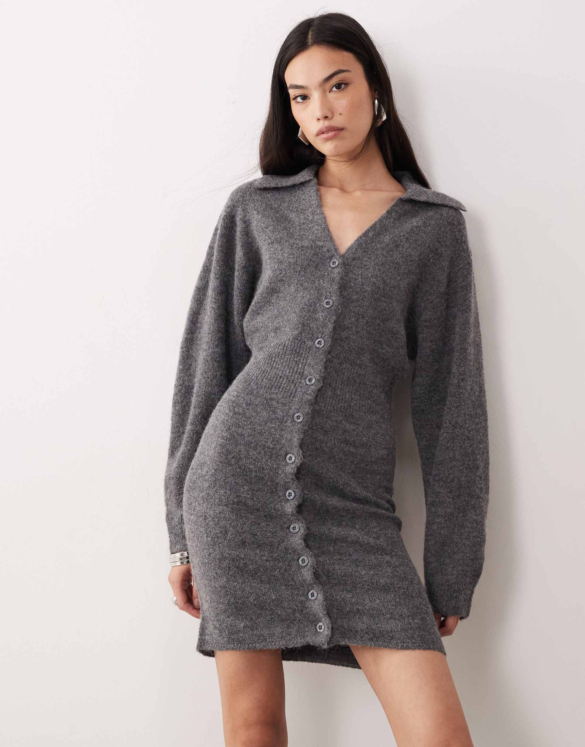 GINA TRICOT LONG SLEEVE KNIT BUTTON DOWN MINI DRESS IN DARK GRAY MELANGE