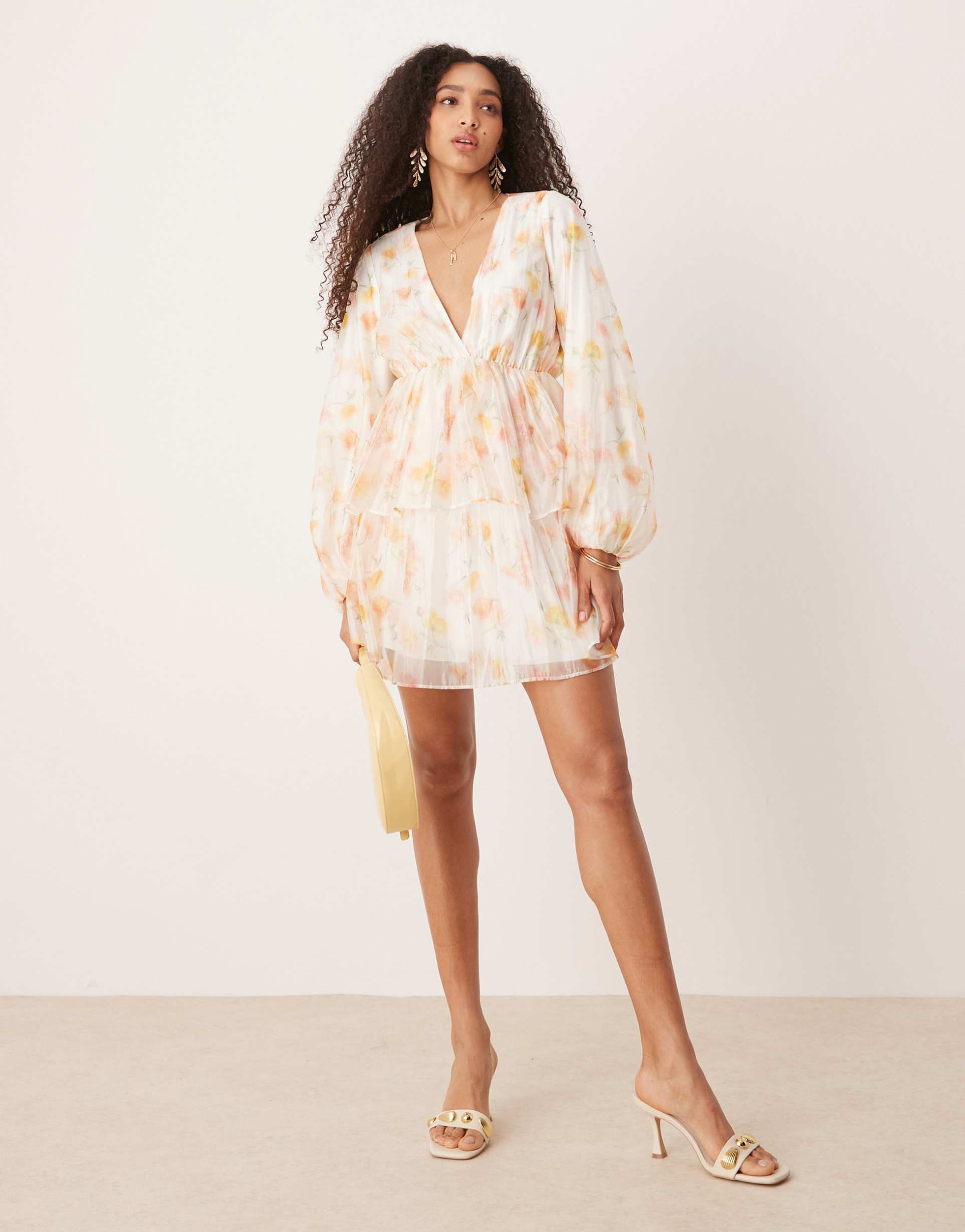 Soft organza fabric shapes a romantic mini dress featuring a deep V-neck and long balloon sleeves. The regular fit and tiered layered hem create a flattering silhouette perfect for spring and summer outings. Adorned with a delicate watercolor floral print in light peach on a matte white base, this dress suits brunches, date nights, and evening events with effortless charm and modern style.