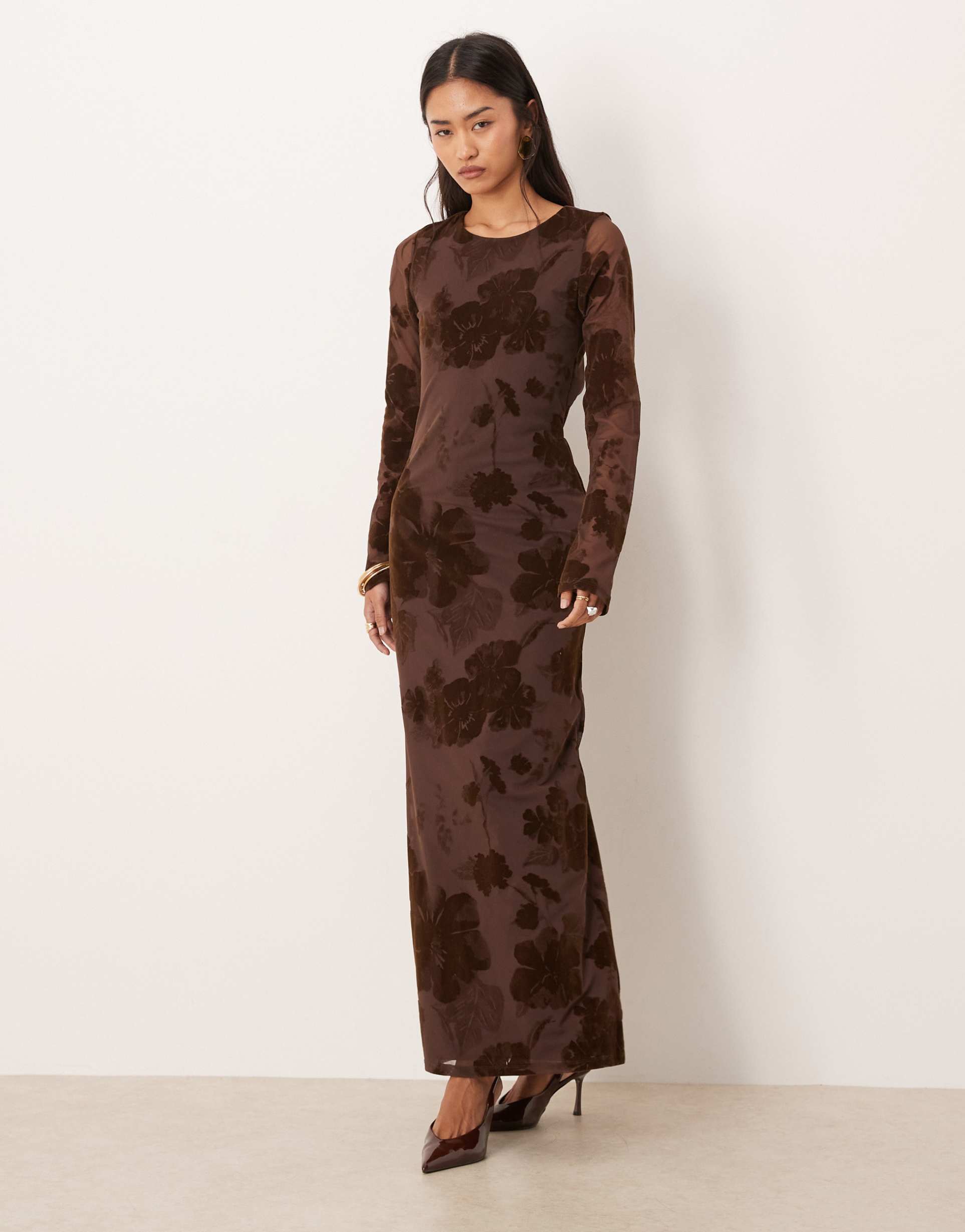A captivating floral mesh burnout pattern adorns this slim-fitting column maxi dress in matte dark brown. Featuring a modest round neck and long regular sleeves, the silhouette is elegantly elongated with a clean hemline. The open back with button closure adds a daring touch, perfect for cocktail evenings, date nights, or sophisticated night outs. Crafted from a polyester and elastane blend, this dress combines comfort with stretch, making it an ideal choice for autumn and winter events where style meets allure.