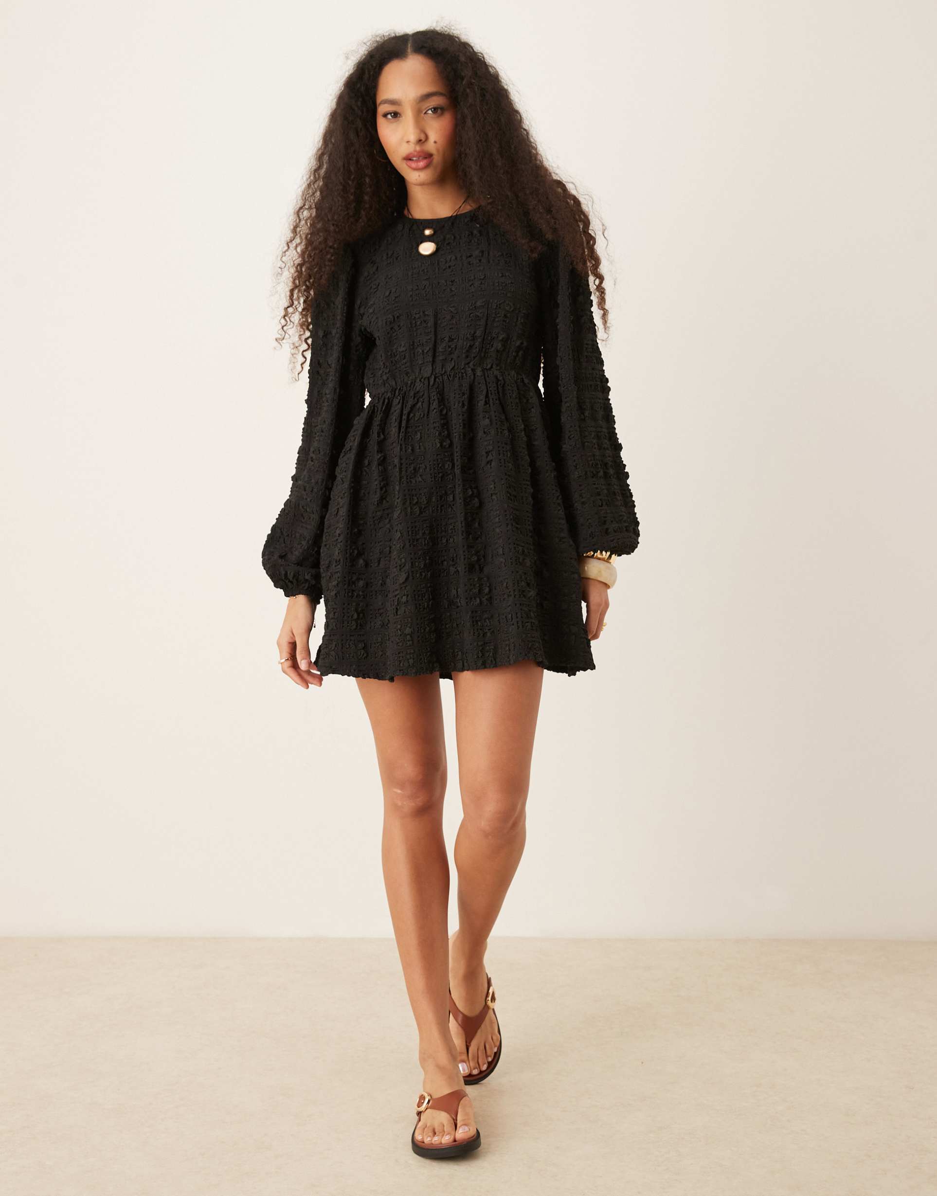GINA TRICOT TEXTURED MINI DRESS WITH OPEN TIE BACK AND VOLUME SLEEVES IN BLACK