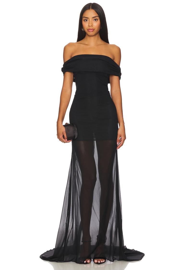A striking black silk sheath dress that hugs the figure with a fitted silhouette and off-shoulder neckline. The sleeveless design features sheer panels extending from the thigh to a dramatic flowing train hemline, adding elegance and sophistication. Crafted with a blend of silk and elastane for comfortable stretch, this gown is perfect for cocktail parties, formal events, and gala evenings. Its timeless style and luxurious fabric make it a standout piece for special occasions.