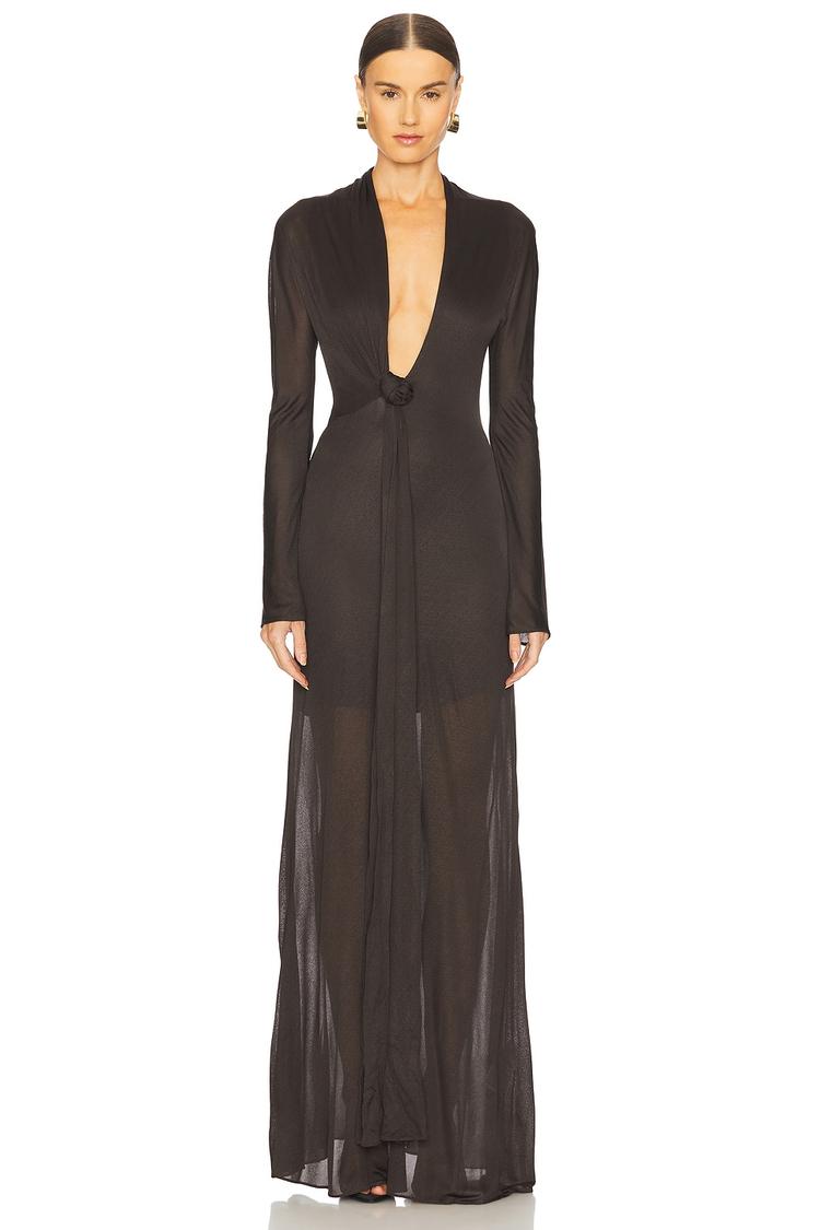 A sleek column silhouette in matte black viscose jersey offers a fitted, floor-length maxi with a dramatic plunging neckline and elegant draped knot detail at the front. The long sleeves and hidden back zipper provide a polished finish, while the textured fabric adds subtle dimension. This sophisticated dress is ideal for cocktail parties, night outs, and romantic date nights, blending modern style with timeless elegance for versatile all-weather wear.