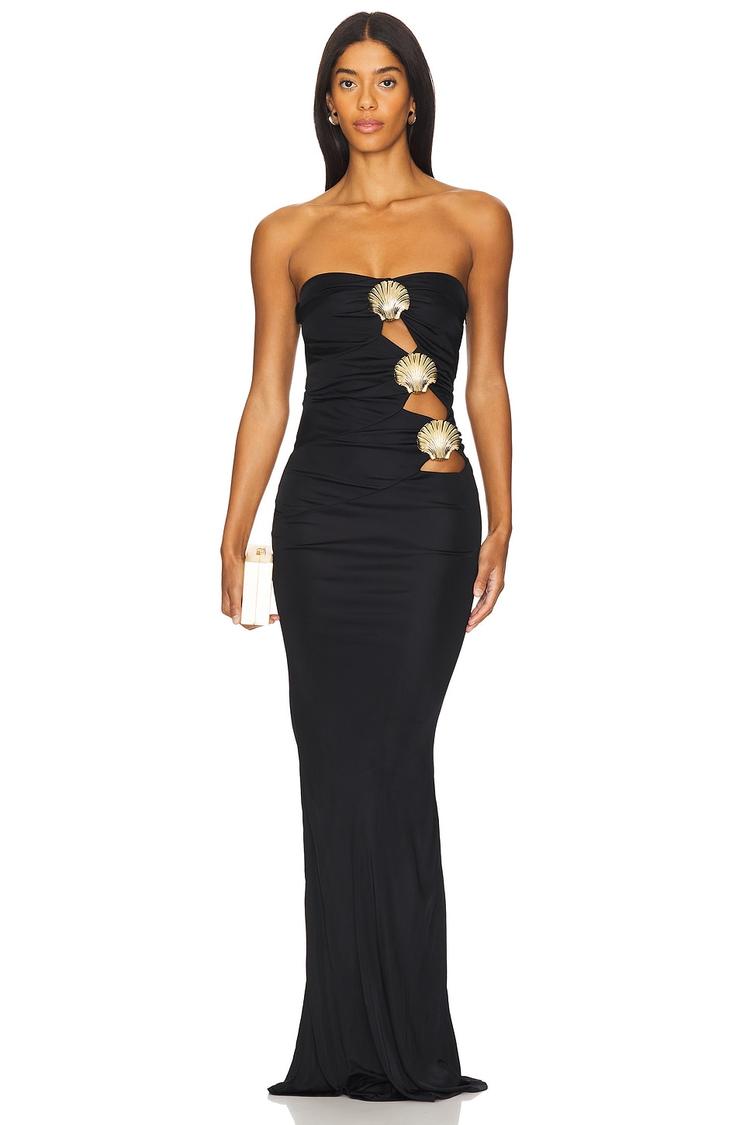 Sleek and sophisticated, this strapless column gown in matte black viscose jersey exudes timeless elegance. The fitted silhouette flows gracefully to a clean maxi hem, while gold-tone shell appliques accentuate the front cut-outs for a striking detail. Designed with a hidden side zipper and non-stick silicone grip trim, it ensures a secure and comfortable fit. Perfect for formal events, cocktail parties, and glamorous evenings, this Italian-made gown combines luxurious fabric with refined design details to create an unforgettable look.