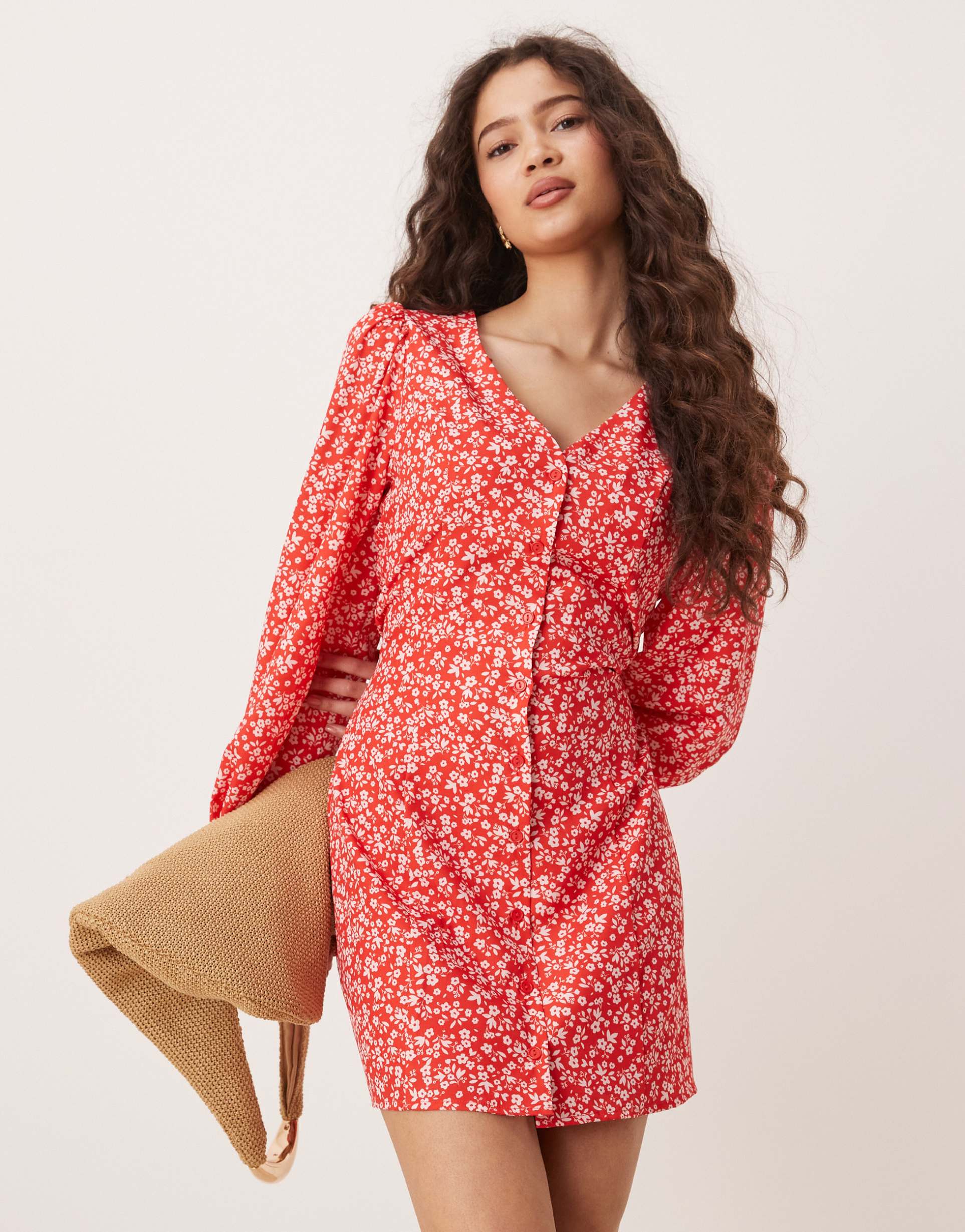 GLAMOROUS LONG SLEEVE BUTTON UP TEA DRESS IN RED DITSY FLORAL