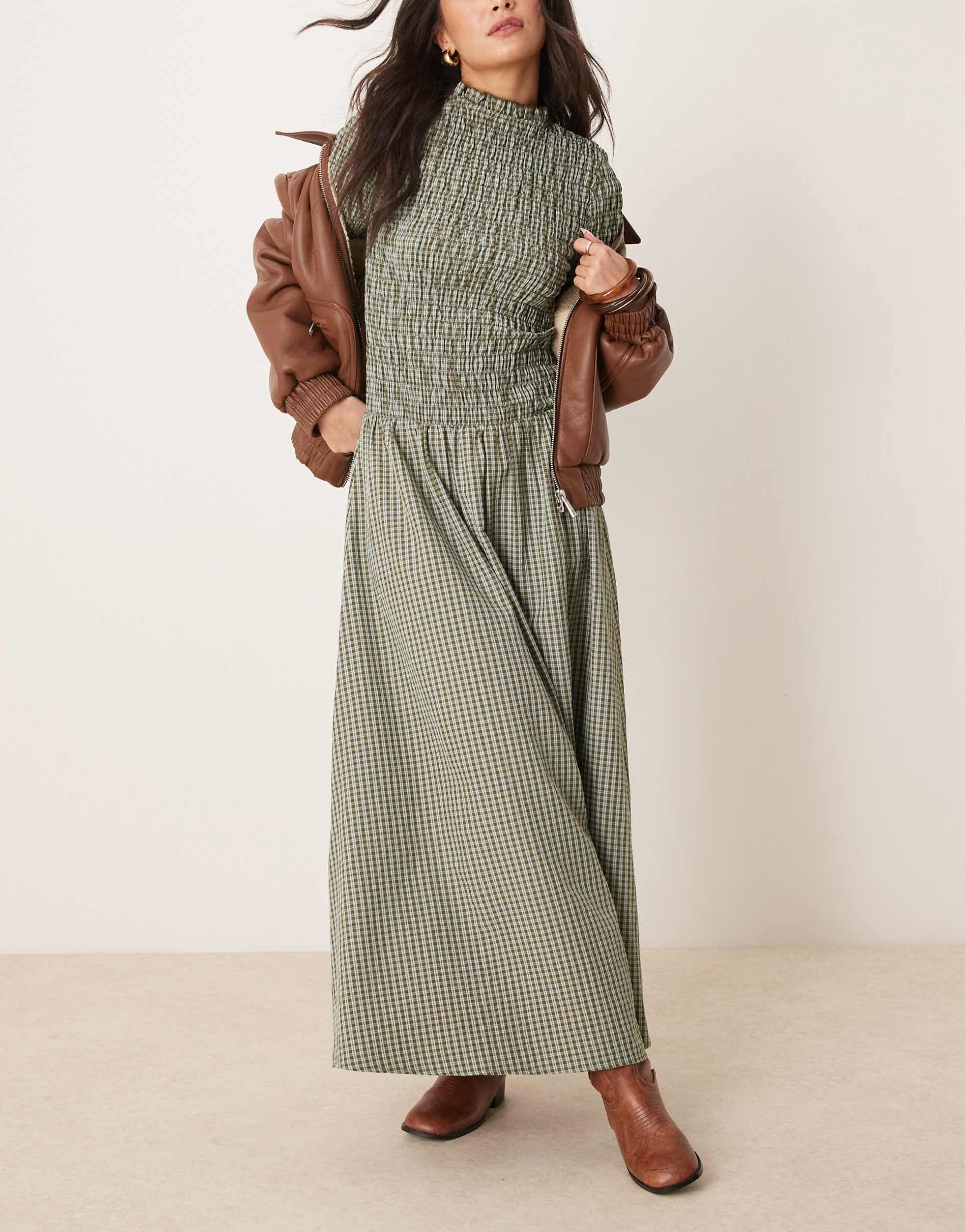 green and blue check maxi dress