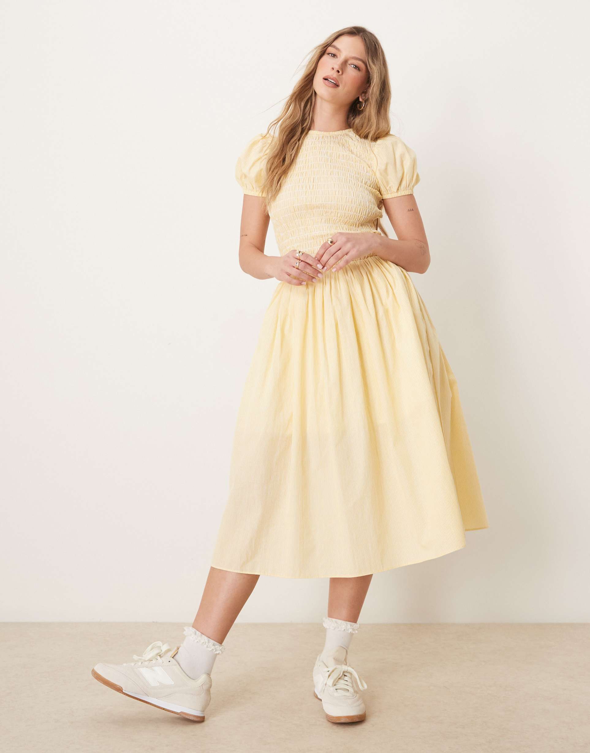 Soft matte yellow stripes and classic puffed half sleeves define this midaxi A-line dress with a comfortable regular fit. The crew neck and smocked stretch bodice add subtle texture and shape, crafted from breathable 100% cotton plain-woven fabric. Its clean hemline and versatile silhouette make it ideal for casual outings, weekend brunches, or everyday wear during spring and summer seasons. Effortlessly chic and easygoing, this dress blends timeless charm with modern comfort for relaxed yet polished style.