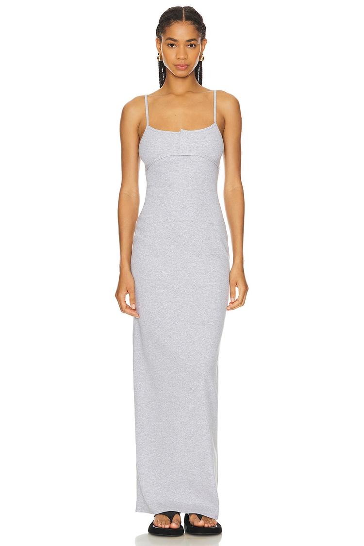Soft ribbed knit fabric in a matte gray hue creates a sleek slip dress with a square neckline and slender spaghetti straps. The maxi length and slim fit silhouette emphasize a minimalist yet chic style perfect for casual days, brunch outings, or relaxed date nights. Featuring a hidden button closure at the bust and pull-on styling, this dress blends comfort and subtle design details, making it an effortless staple for all-weather wear. Its clean hemline and smooth lines enhance its versatile, understated elegance.