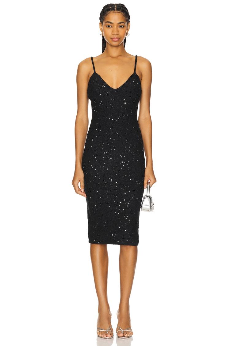 A sleek silhouette meets shimmering glamour in this fitted sheath dress featuring a daring open back and delicate spaghetti straps. Crafted from a rich blend of acrylic, nylon, rayon, wool, polyester, and elastane, it drapes gracefully to a midi length, adorned with all-over silver sequins that catch the light beautifully. The flattering V-neckline and sleeveless design make it a standout choice for cocktail parties, night outs, or romantic date nights during the cooler seasons.