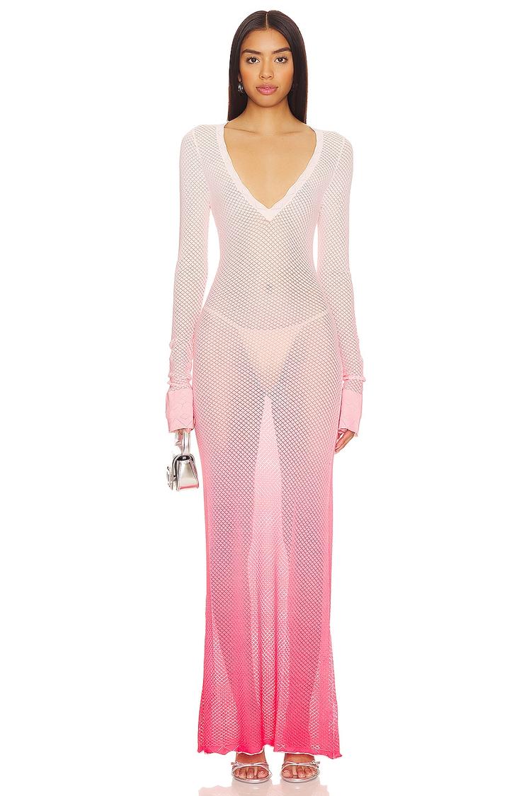 A delicate ombre effect transitions from matte white to pink on this slim-fitting maxi slip dress crafted from breathable rayon and nylon blend. Featuring long regular sleeves and a flattering V-neckline, its semi-sheer open knit fabric adds subtle allure. The clean hemline and covered back lend a minimalist modern touch, perfect for date nights, cocktail events, or stylish summer outings. Easy pull-on styling ensures comfort and effortless elegance for warm-weather occasions.