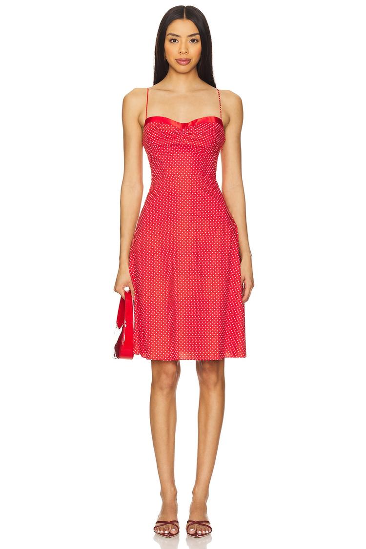 A vibrant red midi dress with a classic fit and flare silhouette, featuring a charming white polka dot pattern all over. The sweetheart neckline and spaghetti straps offer an elegant, sleeveless look, while the back lace-up tie closure adds a stylish and adjustable detail. Crafted from midweight cotton crepe with a hint of elastane for comfort, this dress is fully lined and has boned sides for a flattering shape. Ideal for spring and summer occasions like brunch, date nights, and cocktail parties, it balances timeless style with modern comfort.