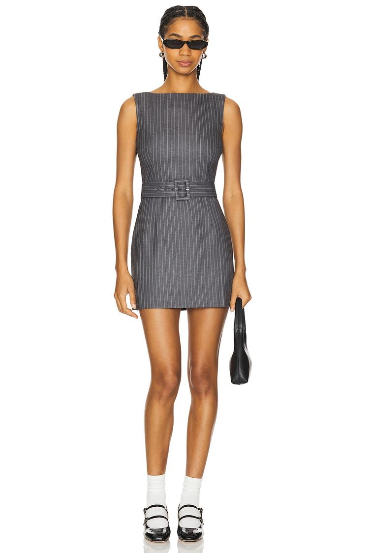 Clean lines and a sleek straight neckline define this fitted mini shift dress with wide straps and an all-over pinstripe pattern in classic gray and black tones. Crafted from a comfortable blend of polyester, rayon, and spandex, it offers a polished silhouette enhanced by a matching fabric belt at the front waist for subtle definition. The sleeveless design and clean hemline make it versatile for workwear, business casual occasions, or stylish brunch and date night looks.