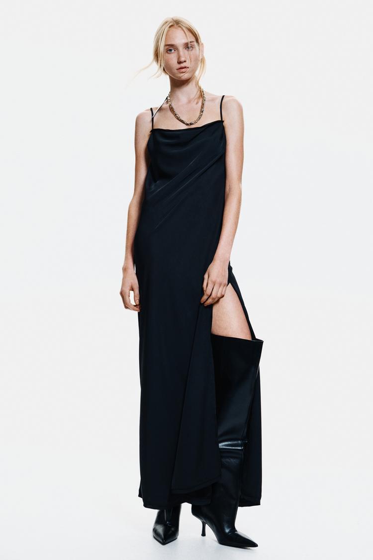 A sleek matte black slip dress crafted from smooth polyester offers an elegant slim fit silhouette with a flowing maxi length. Featuring delicate spaghetti straps and a graceful cowl neckline, this minimalist piece is enhanced by a belt detail with buckle closure at the front, adding subtle edge and structure. The thigh-high slit hemline brings movement and allure, making it ideal for date nights, cocktail parties, or stylish night outs. Versatile for all seasons, this chic dress pairs beautifully with a bomber jacket or boots for a modern, refined look.