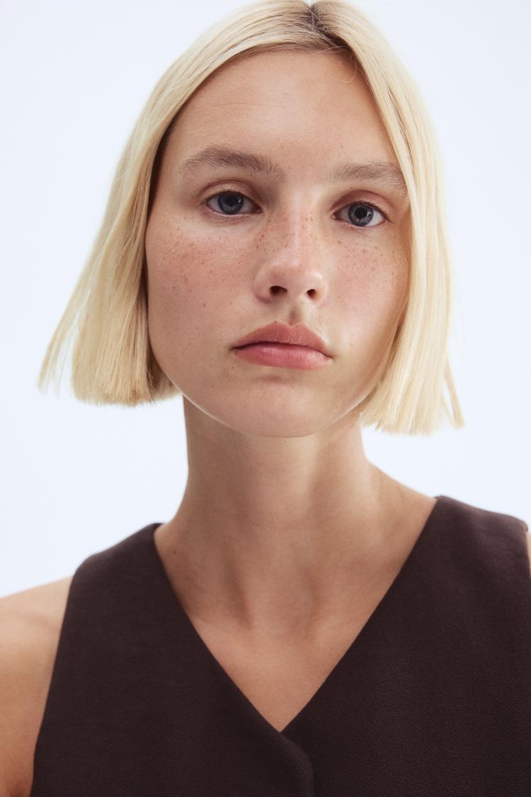 A sleek matte brown shift dress with a flattering V-neck and sleeveless cut offers effortless elegance and comfort. The mini length and clean hemline create a modern silhouette, while the slim black braided belt adds a subtle yet chic design detail at the front. Ideal for casual outings, brunch dates, and relaxed evenings, this versatile dress embodies minimalist sophistication and classic style for year-round wear.