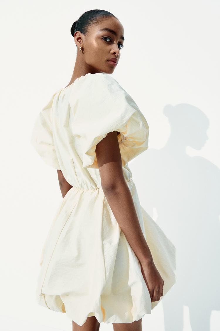 Soft cream cotton fabric shapes a modern swing silhouette with a playful bubble hem that adds volume and movement. The dress features loose balloon sleeves and a round neckline, creating a breezy, comfortable fit perfect for spring and summer outings. Its mini length and ruffled hemline bring a fresh, youthful charm, making it ideal for brunches, date nights, or casual evening events. Slip-on style enhances ease of wear, while the covered back maintains a clean, chic look.