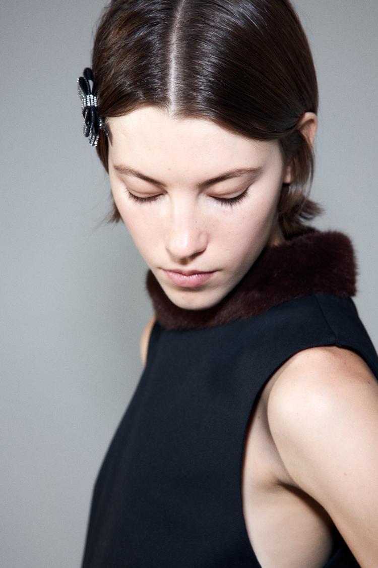 A sleek black shift dress in a regular fit, featuring a sleeveless silhouette and a distinctive brown fur collar that adds a touch of warmth and texture. The mini length and clean hemline create a modern and polished look perfect for autumn and winter seasons. Its minimalist style and classic high neckline make it ideal for casual days, workwear, or business casual events, blending comfort with subtle elegance.