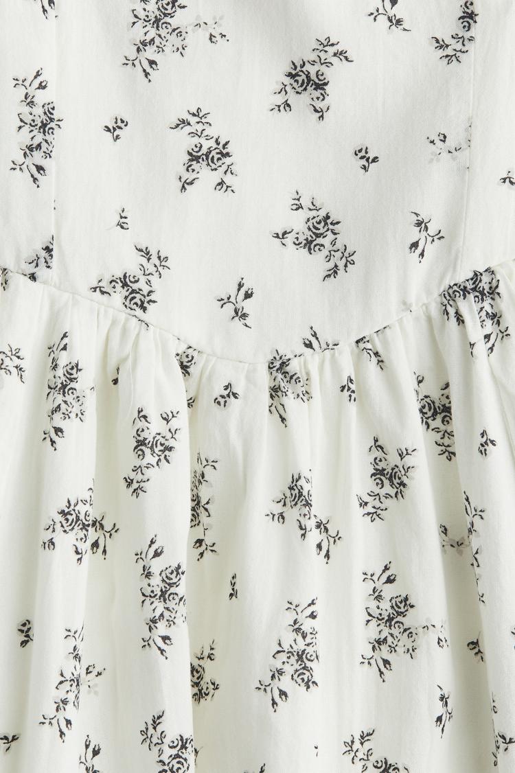 Soft cotton fabric and a playful fit and flare silhouette define this charming mini dress. Featuring a flattering V-neck and wide gathered shoulder straps, the fitted bodice highlights a shaped cup detail while the ruffled hem adds a whimsical touch. The all-over delicate black floral print on a crisp white base makes it perfect for warm spring and summer days. Ideal for casual outings, brunch dates, or relaxed evenings, this dress blends comfort and feminine style effortlessly.