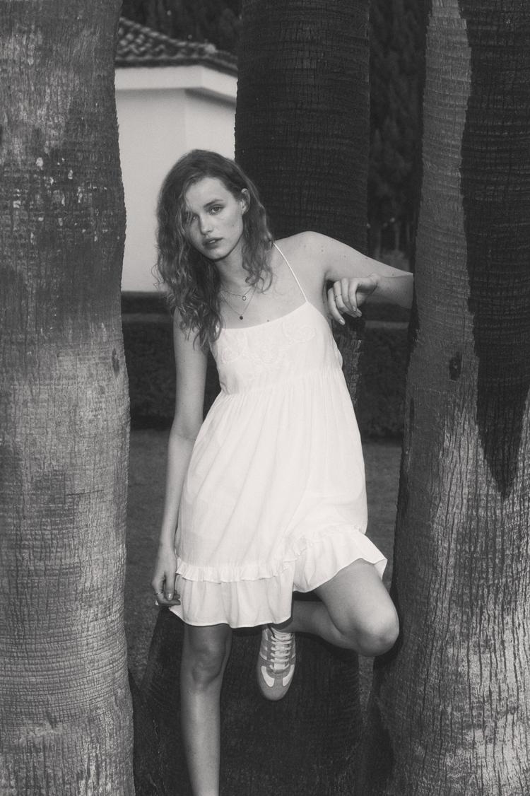 Light and airy cotton fabric combines with delicate spaghetti straps and a straight neckline to create a breezy mini slip dress. The flowy fit and ruffled hem add subtle movement and charm, perfect for warm spring and summer days. Ideal for casual outings, relaxed brunches, or a laid-back date night, this dress offers effortless style and comfort with minimalist elegance.