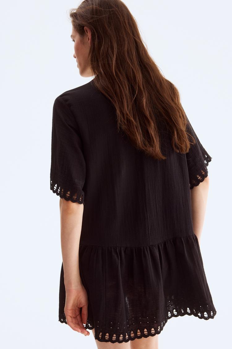 Soft cotton fabric and a relaxed tunic silhouette combine to create a comfortable mini dress perfect for casual outings. Featuring a lace-up V-neckline and half sleeves, this black dress is detailed with ruffled hems and eyelet embroidery on the sleeves and skirt edge, adding subtle texture and charm. Its loose fit and breathable cotton make it ideal for spring through autumn wear. Versatile enough for everyday errands, brunch dates, or laid-back weekend wear, this dress balances minimalism with delicate design details for effortless style.