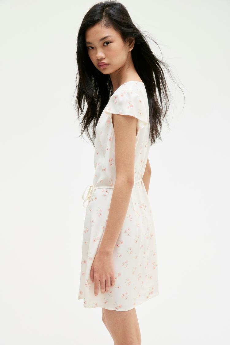 Soft crepe fabric and a delicate floral print create a romantic mini wrap dress ideal for spring and summer outings. The V-neckline and short regular sleeves enhance the classic silhouette, while the open back adds a subtle touch of allure. A belt cinches the waist, offering a flattering regular fit that moves effortlessly. This dress is perfect for casual days, brunches, or date nights, blending comfort with timeless charm.