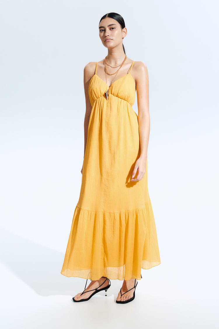 Maxi dress in woven, crinkled cotton. Extra-narrow, doubled shoulder straps that thread through small loops and tie at back. V-neck, low-cut back with narrow elastic, and gathered seam below bust and below knees for added volume. Lined at top.
