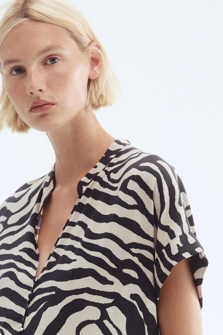 A crinkled texture meets bold animal print in this loose-fitting tunic dress, designed with a mini length and half sleeves finished with cuffs. Its V-neckline and button front detail add subtle charm while maintaining a relaxed silhouette perfect for casual outings, brunches, or everyday wear in spring and summer. The matte black and beige color-blocked pattern enhances its modern, casual chic style, making it an effortless statement piece that combines comfort with eye-catching design.