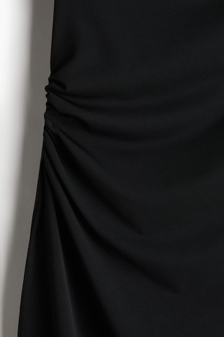 Fitted, sleeveless, calf-length dress in stretch jersey with a slight sheen. Cowl neckline and gathers on shoulders and at one side of waist for a draped effect. Partly lined.