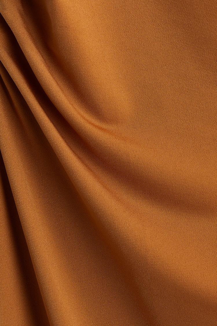 Soft satin fabric and a figure-hugging sheath silhouette define this draped midi dress in a warm tan hue. The sleeveless cut with a draped neckline adds effortless elegance, while the clean hemline enhances its minimalist sophistication. Perfectly tailored to flatter the body, this versatile piece transitions seamlessly from cocktail events to date nights and evening outings. Its simple yet chic design makes it an essential for those seeking understated glamour and comfort in a regular-sized, all-weather style.
