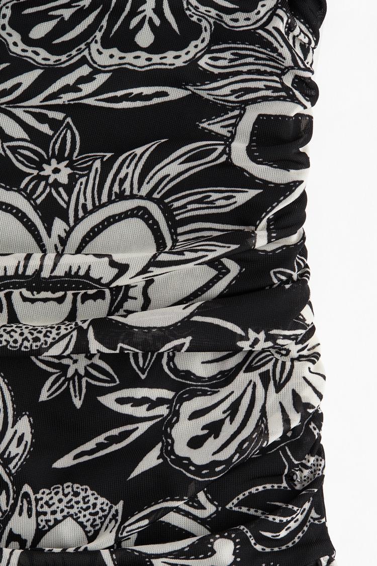 Bold matte black fabric with a striking white floral print creates an eye-catching draped one-shoulder dress silhouette. The sleeveless style and elegant draping throughout give this piece a sexy and sophisticated vibe, perfect for cocktail evenings, date nights, or a night out. Its versatile design suits all seasons while the flowing draped details add texture and movement, making it a standout choice for elegant occasions.