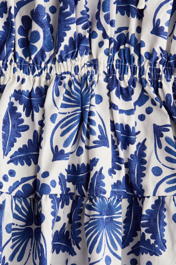 Sunlit strolls and casual brunches come alive with this easy-fit shift dress crafted from crisp poplin. The mini length and ruffled hem add playful movement, while the blue floral print on a white base enhances its fresh spring-summer vibe. A flattering V-neck with a tie-up drawstring detail at the front elevates the look, complemented by short regular sleeves. Perfect for casual chic moments, this dress suits daytime dates, relaxed weekends, and stylish city walks with effortless charm and comfort.