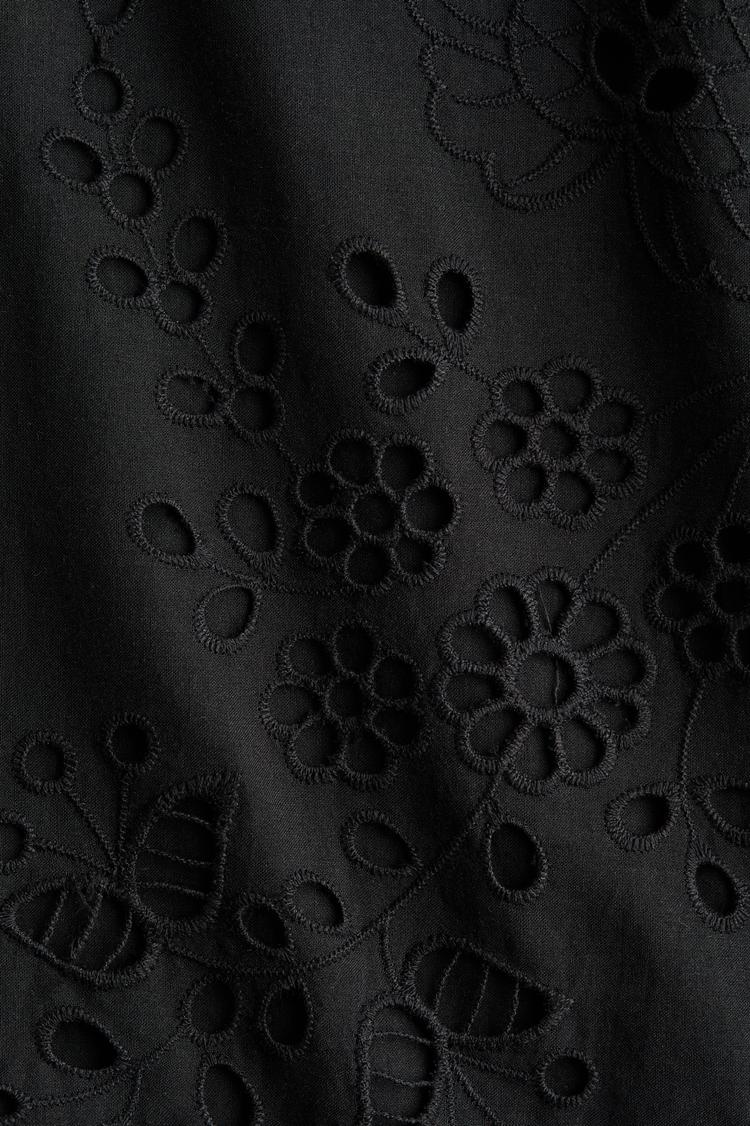 Delicate eyelet embroidery in matte black cotton gives this mini shift dress a bohemian edge. Featuring a V-neck, long regular sleeves, and a ruffled hemline, it offers a loose, comfortable fit perfect for casual outings, brunch dates, or relaxed evenings. The button closure and covered back add subtle structure while maintaining an effortless silhouette. Ideal for spring through autumn, this versatile piece combines classic craftsmanship with casual chic style.