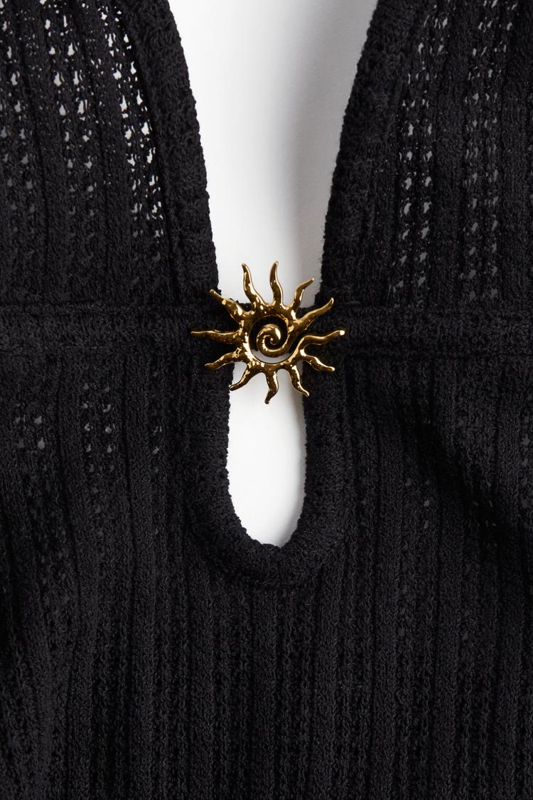Long, fitted, halterneck dress in a soft pointelle knit with a crocheted look featuring a deep, V-shaped neckline and a metal decoration in the shape of a sunburst at the centre of the bust. Mermaid skirt and a straight hem. Unlined.
