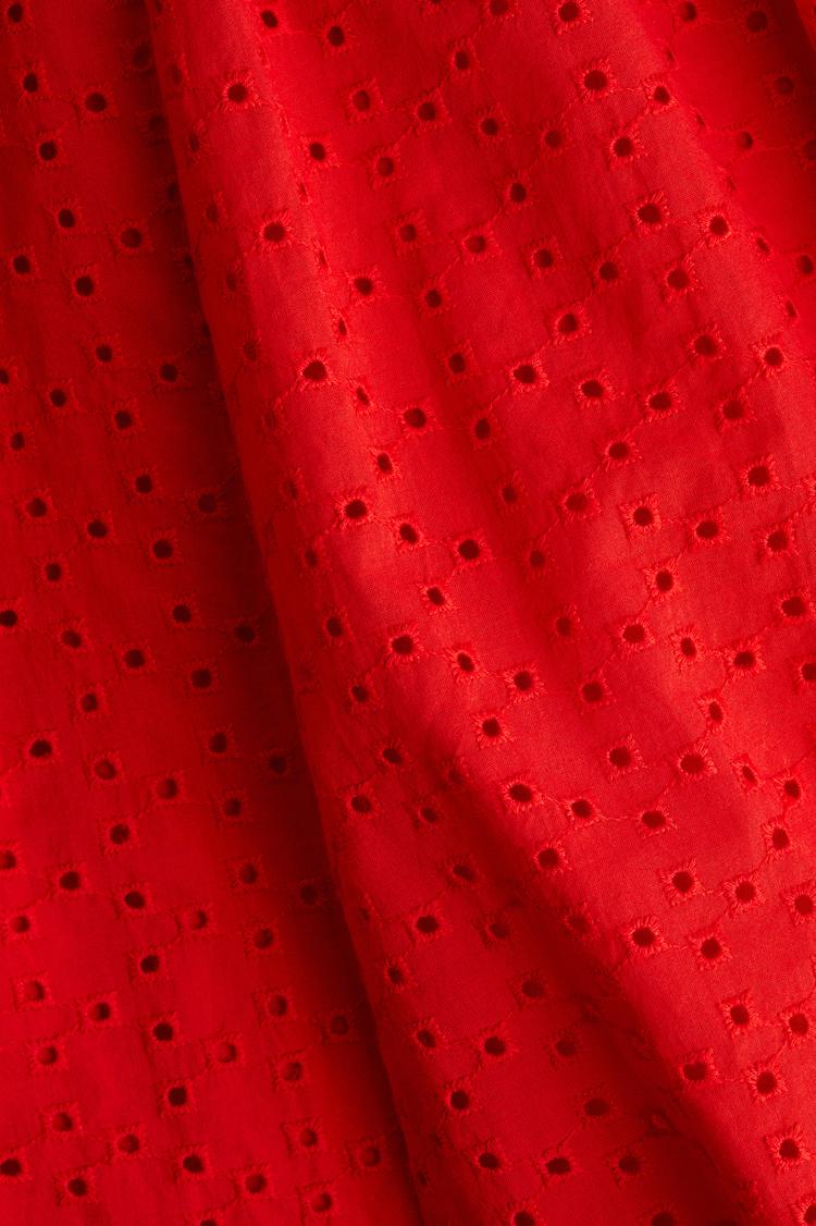 Bright and breezy, this red eyelet-embroidered dress features a delicate V-neckline and slender spaghetti straps that enhance its casual chic vibe. The regular fit and mini length create a flattering A-line silhouette perfect for warm spring and summer days. Crafted from breathable cotton, the dress showcases intricate all-over embroidery that adds subtle texture without overwhelming the solid red tone. Ideal for casual outings, brunches, or vacation days, its clean hemline and slip-on closure keep the look effortless and comfortable.