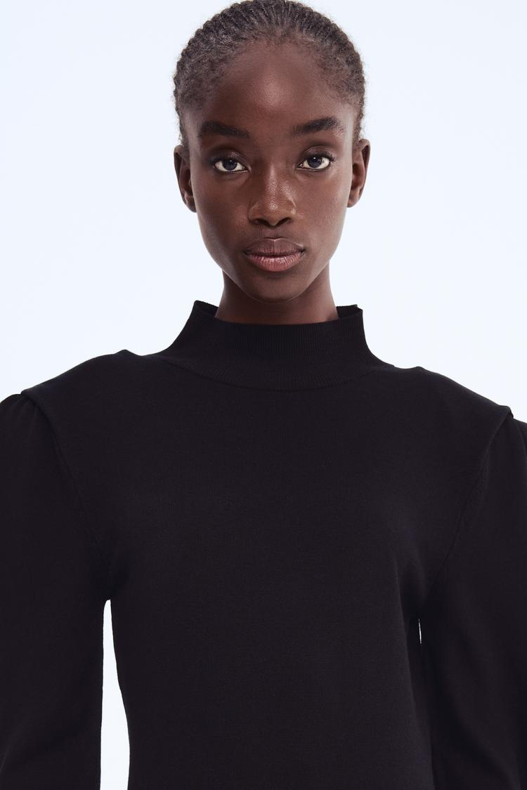 A sleek matte black fine-knit maxi dress offers a streamlined sheath silhouette with long regular sleeves and a refined high neck. The slim fit contours gracefully, perfect for cooler autumn and winter days. Its minimalist design and clean hemline lend an elegant, classic vibe suitable for workwear, business casual settings, or an intimate date night. Crafted from cozy knit fabric, this dress combines warmth with sophisticated simplicity, making it a versatile staple for the modern wardrobe.