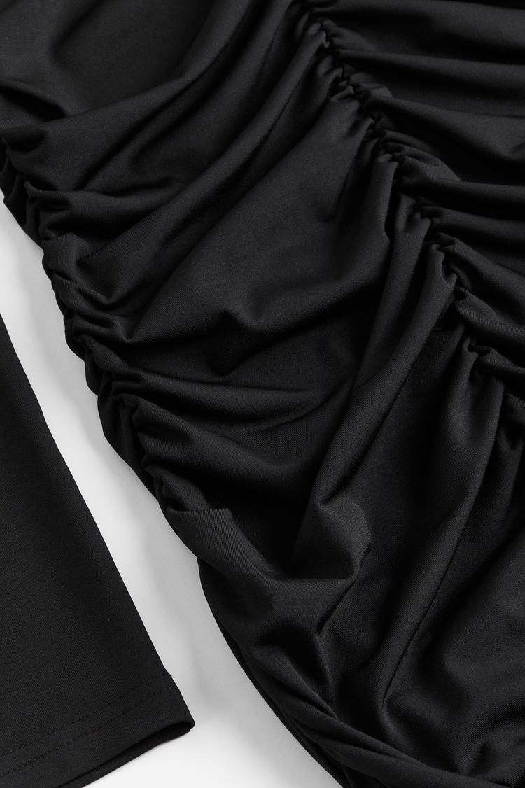 A sleek matte black mini dress crafted from stretch jersey fabric showcases a fitted sheath silhouette with long sleeves and a distinctive low stand collar. The front and sides feature elegant gathered seams that create a flattering draped effect, adding texture and visual interest. This minimalist piece transitions effortlessly from casual outings to date nights and evening events, making it a versatile addition to your wardrobe. The clean hemline and body-skimming fit emphasize a modern, chic style perfect for all seasons.