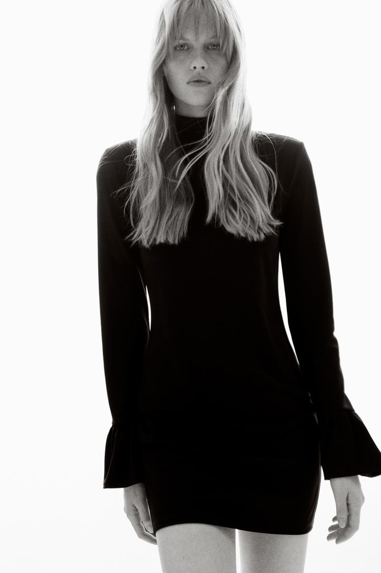 A sleek black sheath silhouette with a high neckline and fitted long sleeves, this mini dress is elevated by its subtle glittery shoulder pads and cuffed sleeve details. The clean hemline enhances its streamlined look, making it an ideal choice for cool autumn and winter evenings. Perfect for casual outings, date nights, or a night out with friends, this classic chic dress combines understated glamour with versatile style.