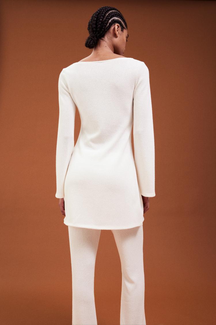 Soft knit fabric and a flared mini skirt combine for a refined yet comfortable silhouette in this off-white dress. The fitted bodice with long sleeves and a classic round neckline offers a minimalist aesthetic perfect for casual outings, everyday wear, or smart work settings. Its clean hemline and streamlined back add to the timeless elegance, making it an easy-to-style piece for the transitional seasons of autumn, winter, and spring.