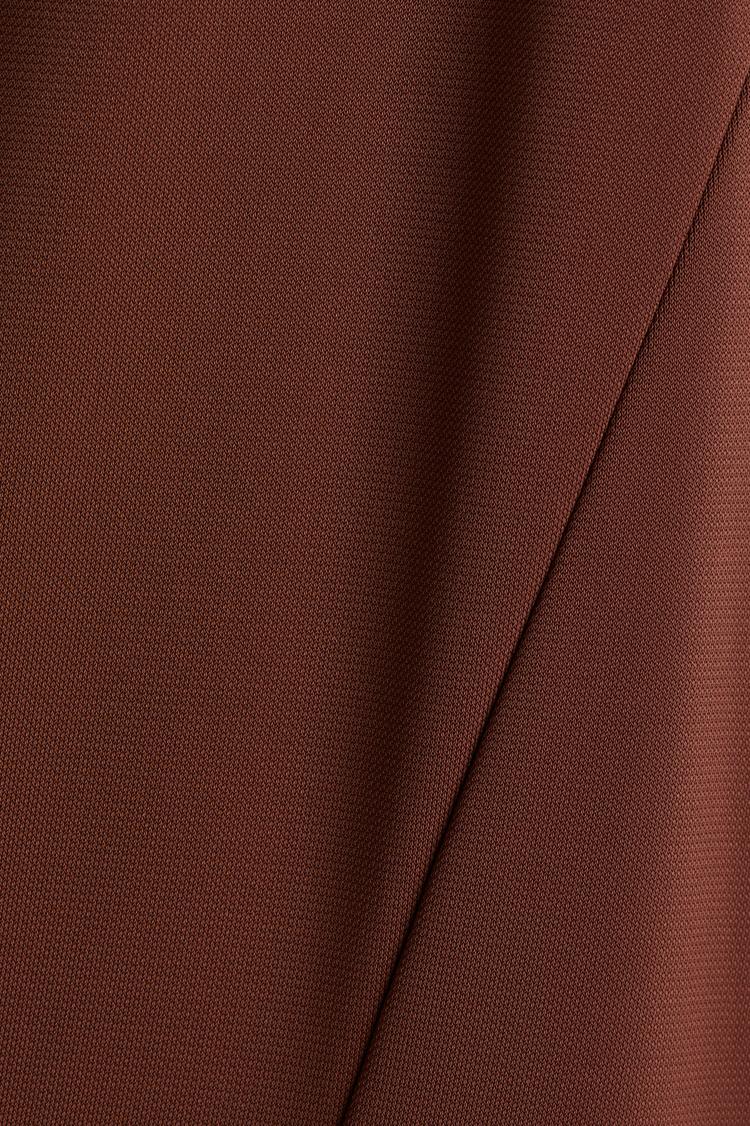 Soft matte brown fabric sculpts a fitted sheath silhouette with a sleek midi hemline, perfect for versatile styling. The sleeveless design and wide straps frame a classic round neckline, while the front knot-detail bow adds a subtle elegant accent. Crafted from smooth polyester, this dress offers easy slip-on wear ideal for date nights, cocktail events, or polished workwear occasions. Its minimalist, modern vibe ensures effortless sophistication across seasons, making it a timeless addition to any wardrobe.