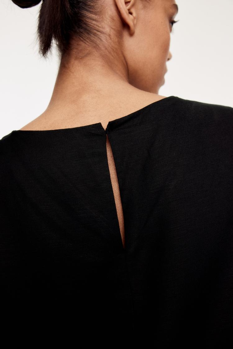 Soft linen and viscose blend fabric brings breathable comfort to this matte black A-line mini dress. The classic round neckline and half sleeves provide a modest yet stylish look, enhanced by a keyhole opening at front and back adorned with a metallic gold button for subtle elegance. Its regular fit and clean hemline create a flattering silhouette perfect for casual outings, workwear, or brunch dates during spring and summer. Lined with cotton voile, this dress combines comfort and refined simplicity for versatile everyday wear.