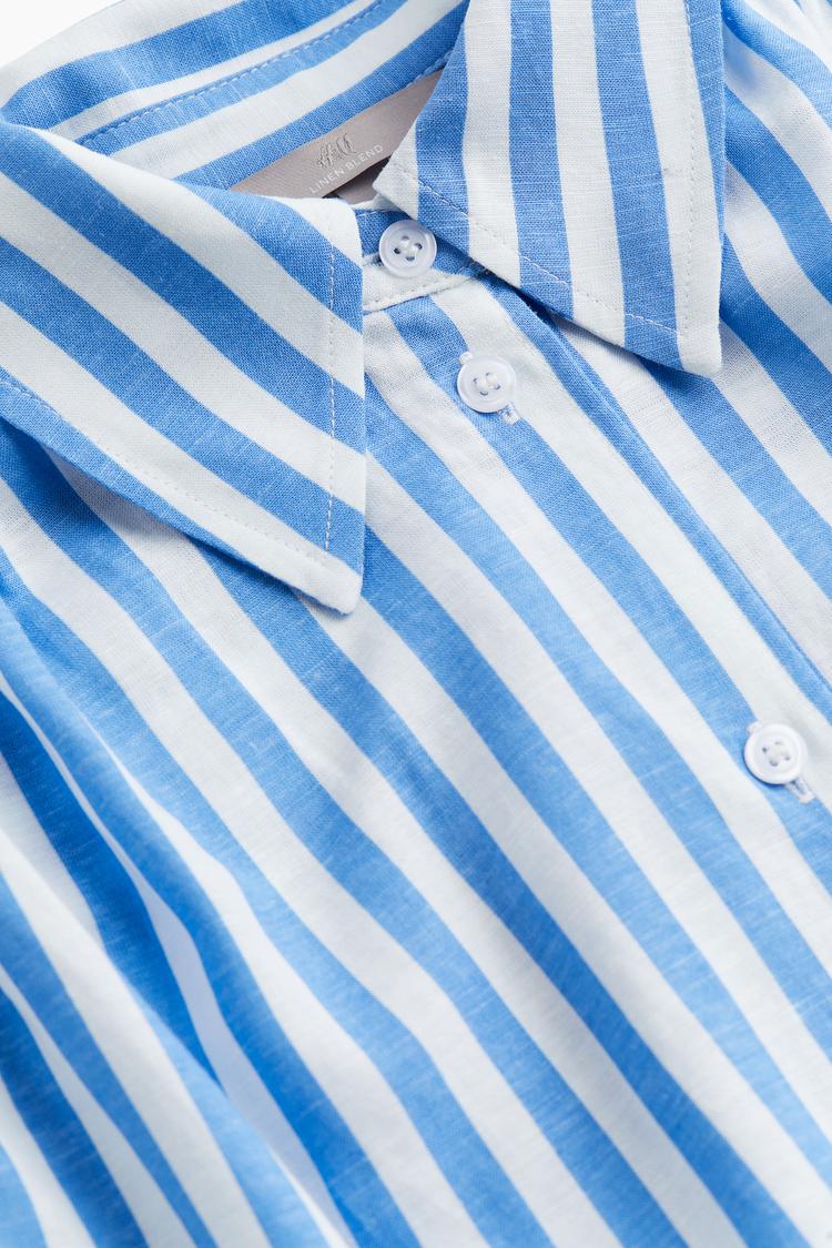 Breezy linen and viscose blend fabric shapes this knee-length shirt dress with a classic collar and sleeveless design. The airy woven texture combined with a narrow removable tie belt creates an adjustable fit that flatters the waist. Its blue and white striped pattern runs all over, complemented by a gathered double-layered yoke at the shoulders and back for subtle ruffle detail. Ideal for casual spring and summer days, this versatile dress suits brunches, workwear, and relaxed weekend outings with effortless style and comfort.