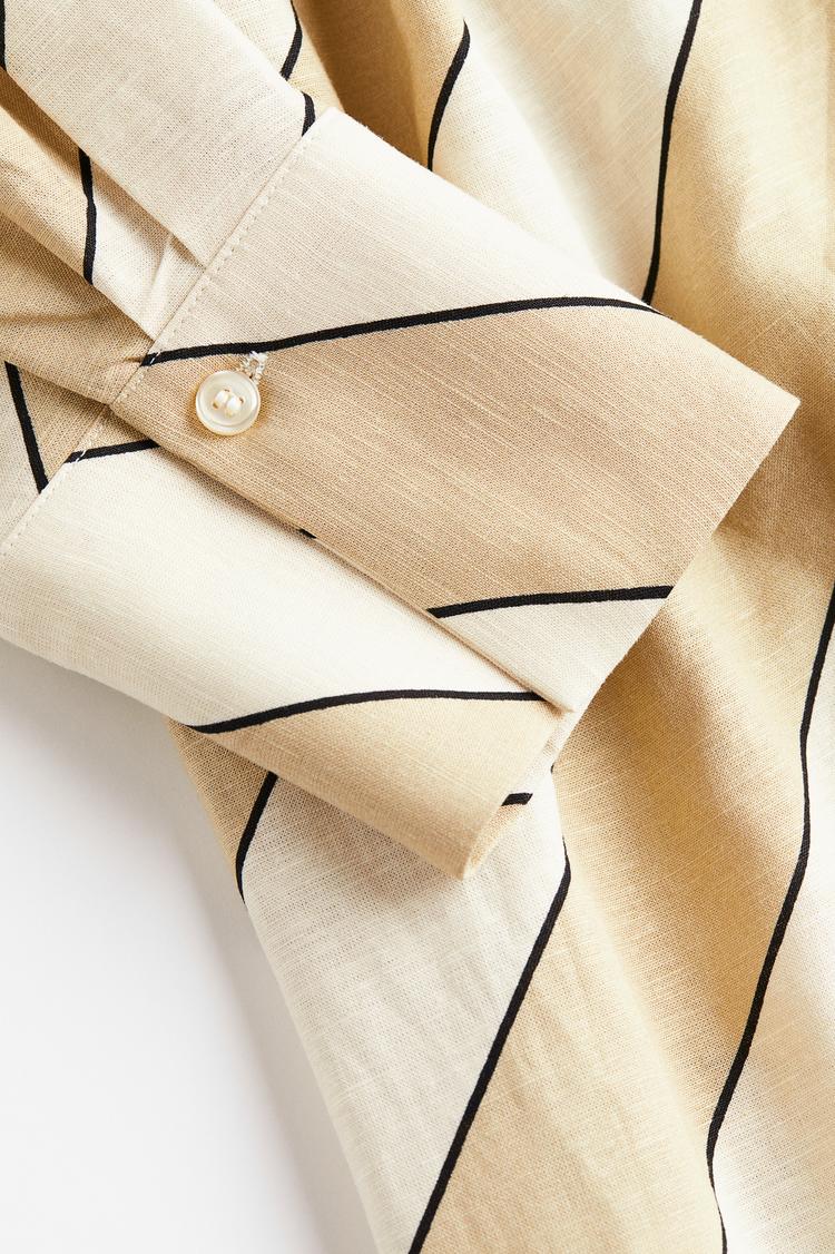 Calf-length shirt dress in an airy, woven viscose and linen blend. Collar, V-shaped neckline, wrapover front, and a wide tie belt at waist. Long sleeves and wide cuffs with slit and button. Unlined.
