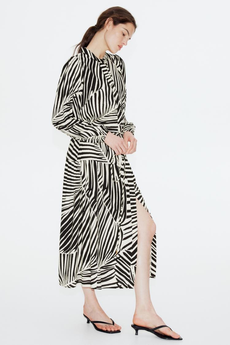 A striking ankle-length shift dress features a bold black and white abstract pattern that commands attention. Crafted from lightweight polyester, it boasts a band collar and long puff sleeves with elasticized cuffs for a modern yet elegant silhouette. The gathered seam below the hips adds volume, enhanced by a removable slim tie belt to define the waist. The front concealed buttons maintain a sleek look, while a side slit hemline adds subtle allure. Ideal for brunch, date nights, or sophisticated workwear in spring and autumn.