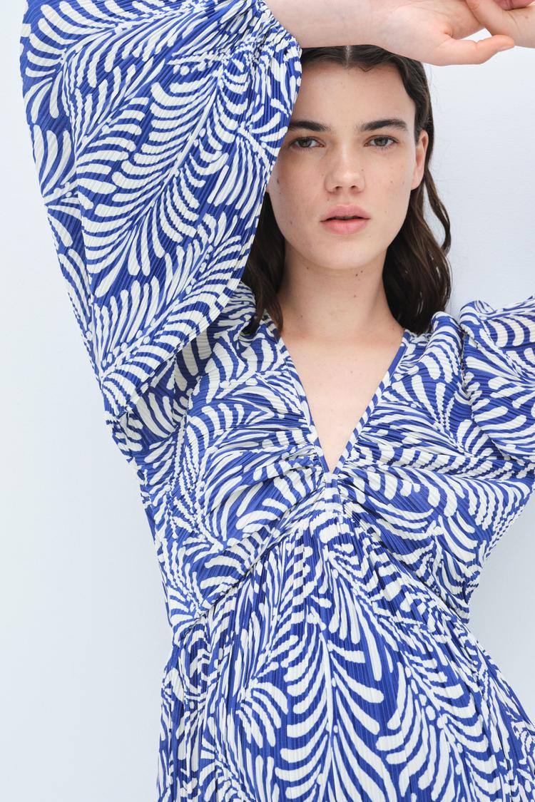 Short dress in plisse jersey. Low-cut V-neck, seam below bust, and long balloon sleeves with elasticized cuffs. Flared skirt with a gathered seam for added volume. Lined over bust.