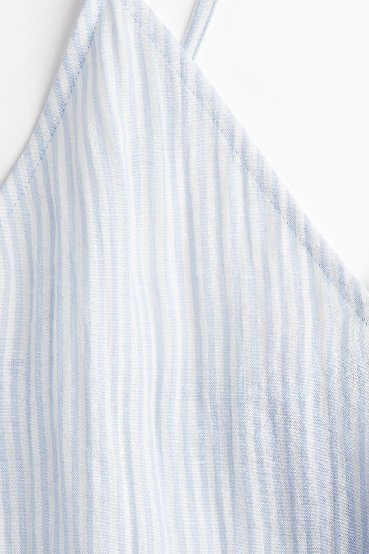 Lightweight cotton fabric and a breezy loose fit define this open-back slip dress, featuring delicate blue stripes on a crisp white base. The mini length and spaghetti straps complement the minimalist V-neckline, creating an effortlessly chic silhouette. Perfect for warm spring and summer days, it suits casual outings, beach trips, and relaxed brunches with friends. The strappy back detail adds a subtle touch of allure while maintaining comfort and ease with a simple slip-on style.