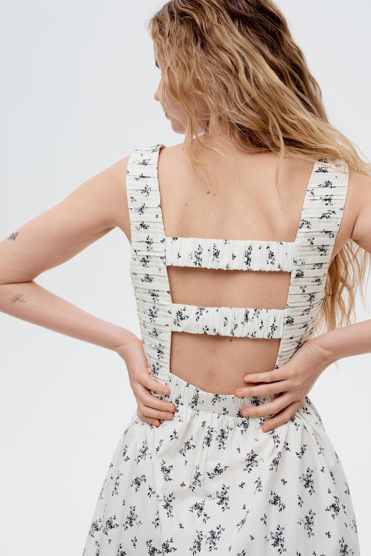 Delicate pintuck pleats adorn the bodice and wide shoulder straps of this crisp cotton poplin fit and flare dress, creating a refined texture against its white base with black floral print. The square neckline and elasticized horizontal back straps add a modern twist, while the gathered waist flows into a flattering midi-length flared skirt. Perfect for spring and summer, this classic casual chic piece works wonderfully for everyday wear, brunches, or romantic date nights with its light, breathable cotton fabric and timeless silhouette.