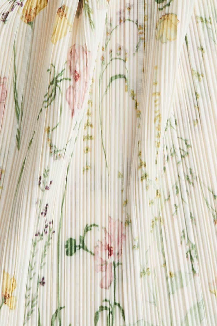 Soft plissé cotton-linen fabric and romantic balloon sleeves with delicate ribbon ties at the cuffs create an effortlessly feminine silhouette. This relaxed A-line mini dress features a low-cut V-neck and diagonal seams below the bust for subtle shaping. The all-over floral and striped print in pastel hues complements the raw edge hem for a breezy spring and summer look. Perfect for casual outings, brunch dates, or daytime events, this versatile piece blends bohemian charm with elegant details for a timeless wardrobe staple.